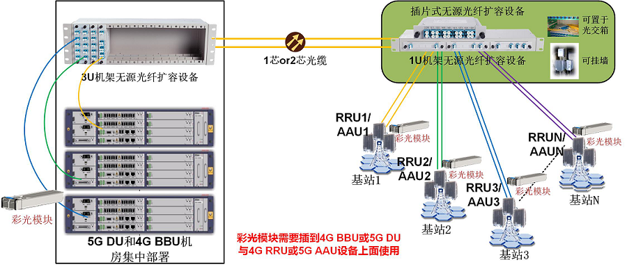 无源方案需要在BBU/DU池与RRU/AAU之间部署无源光纤扩容设备,无源光纤扩容设备之间只需要一对光纤即可,同时需要在RRU/AAU和BBU/DU的CPRI接口更换我公司提供的光纤扩容SFP彩光模块。
